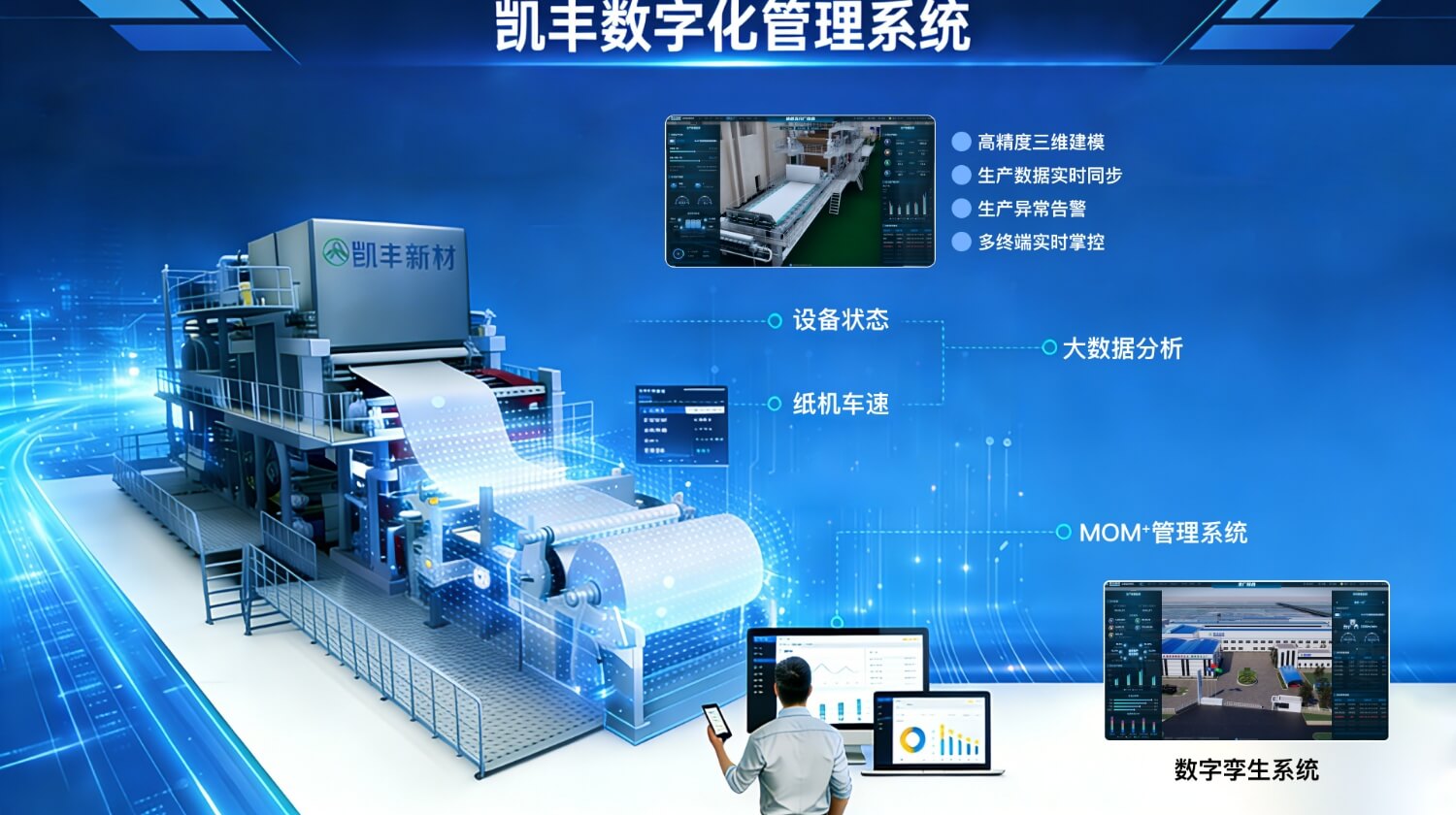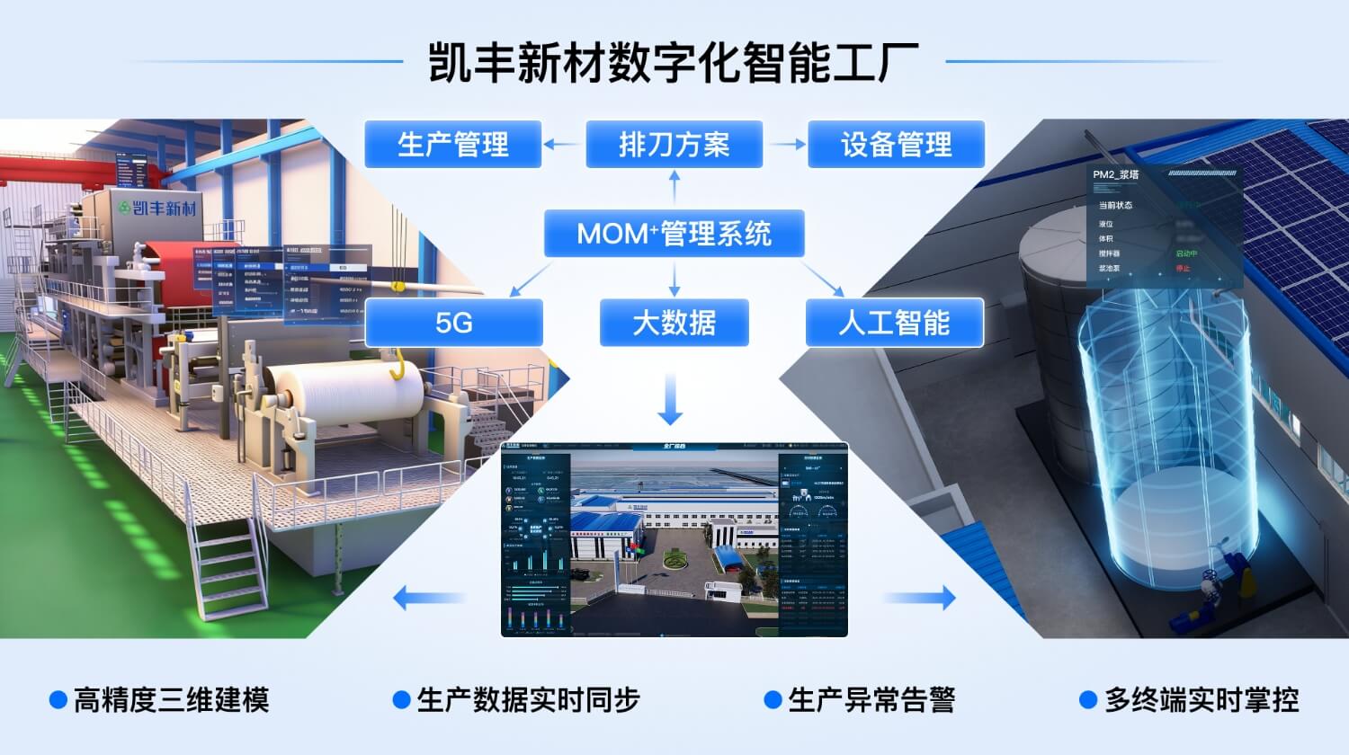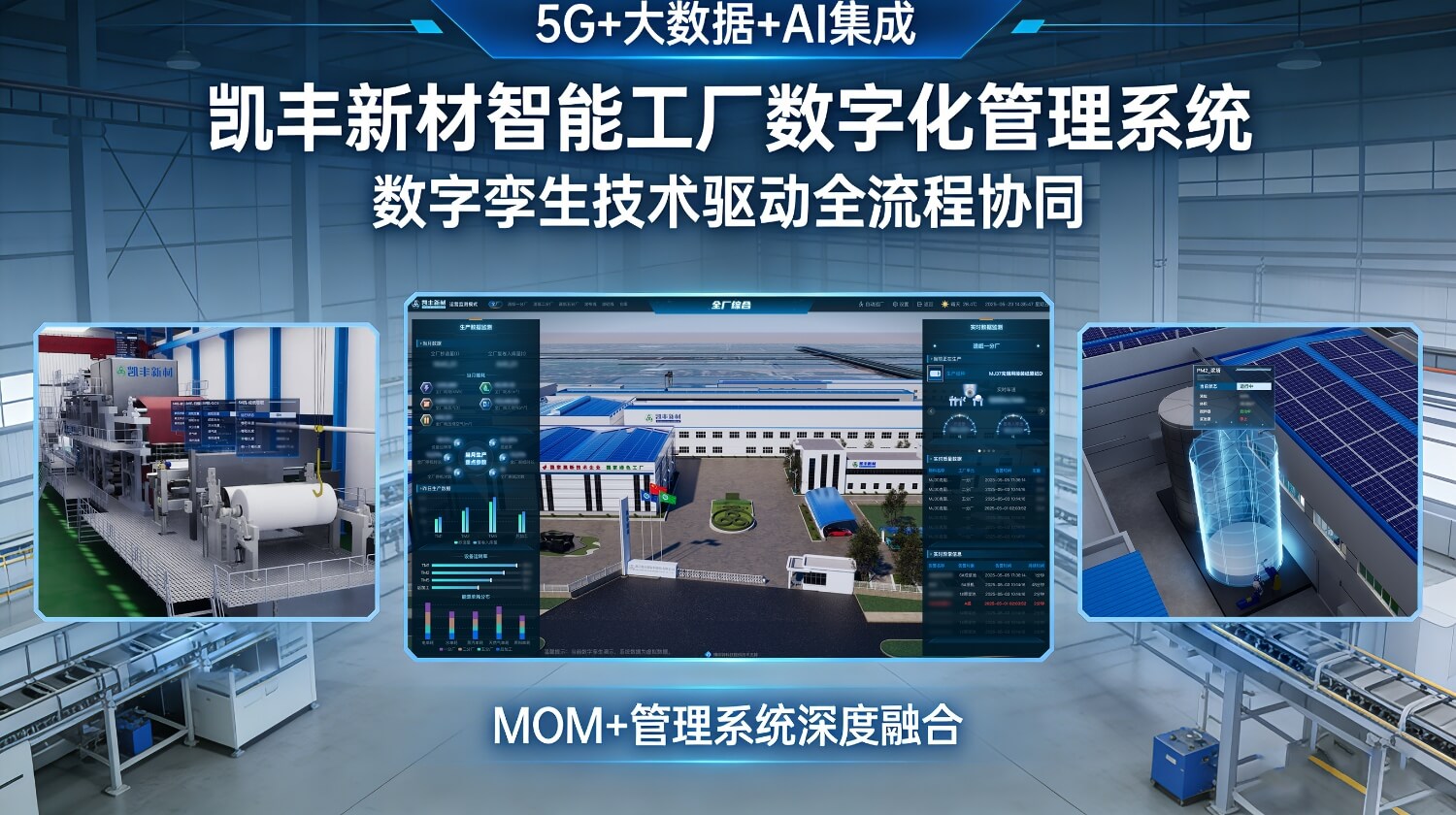 凯丰新材深度推进数字化转型,引入先进数字孪生技术,构建覆盖全厂至工位的数字孪生系统,并与 MOM + 管理系统深度融合,集成 5G、大数据、人工智能等新一代信息技术,实现产品全生命周期、企业运维全过程协同数字化管理。