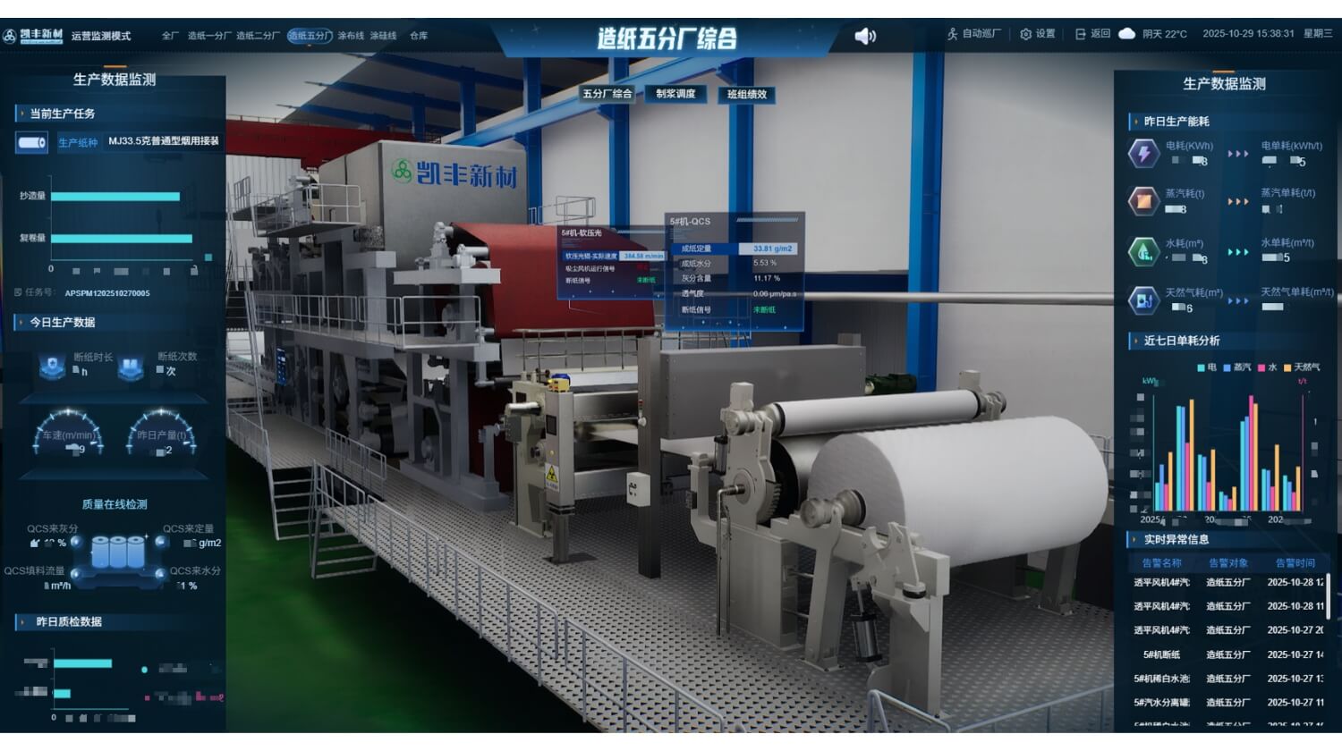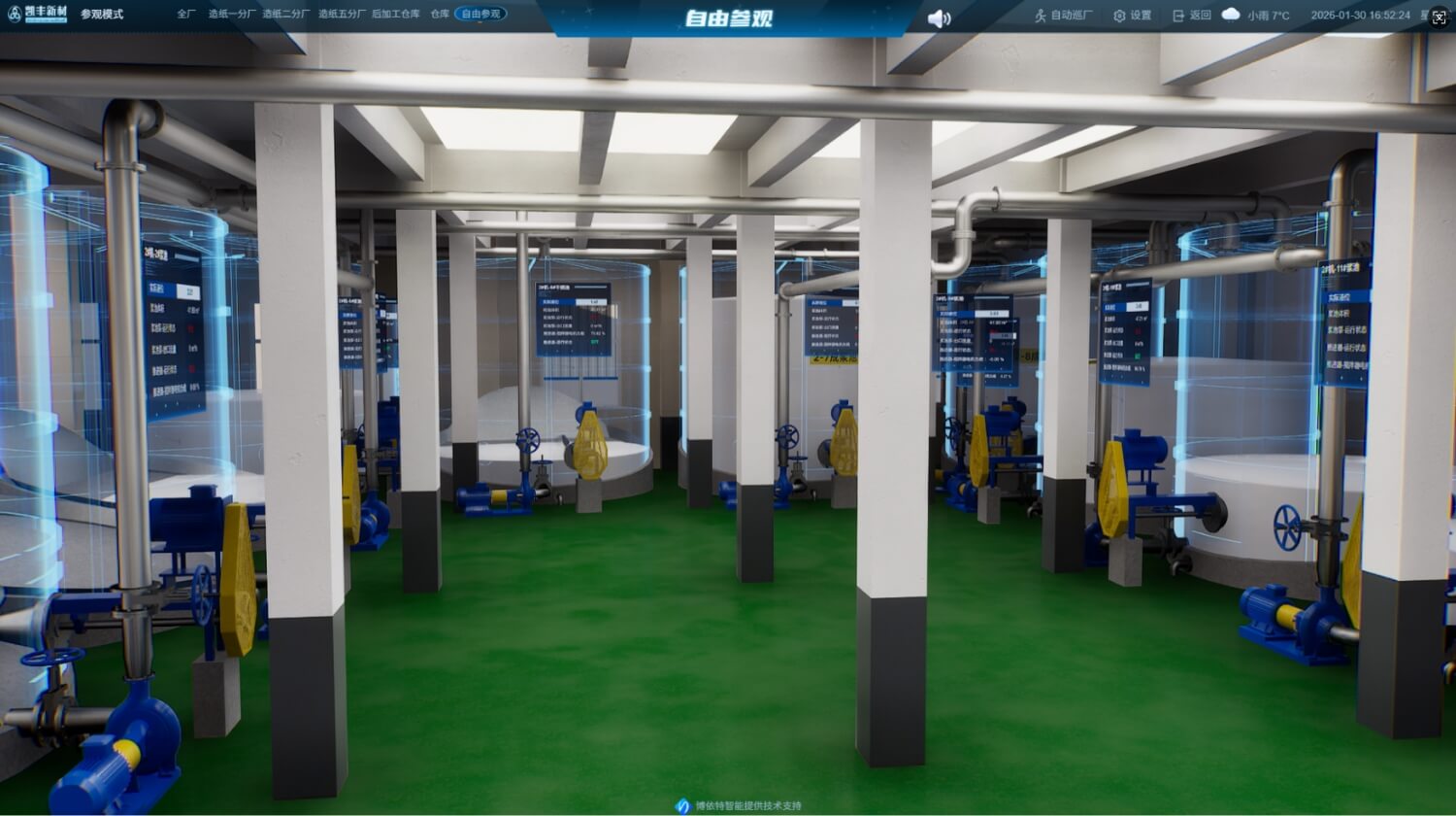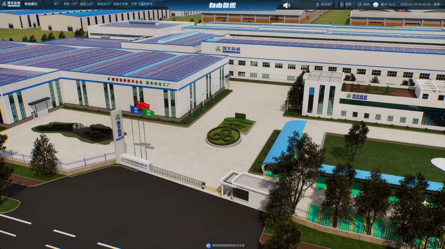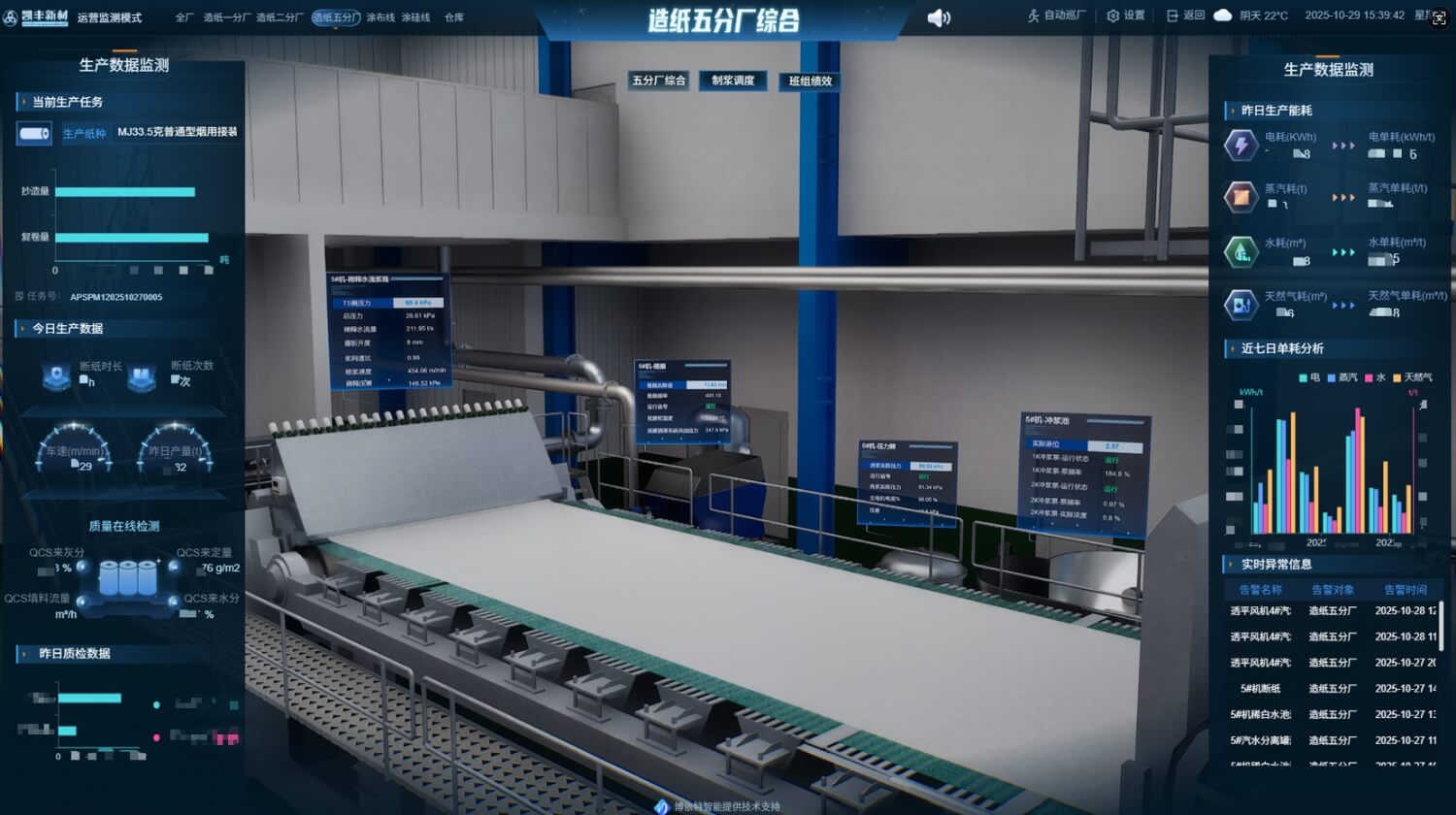 公司通过高精度三维建模、物联网实时数据采集与大数据分析,让物理生产现场与虚拟工厂实时同步,动态呈现设备状态、浆池容量、纸机车速、产线库存及异常告警等关键信息,打造可视化、可控化、智能化生产管理体系。管理者可通过多终端实时掌控全厂运行,快速预判问题、科学调度生产,以数智化能力保障高效生产与品质稳定,全面迈入智能工厂时代。